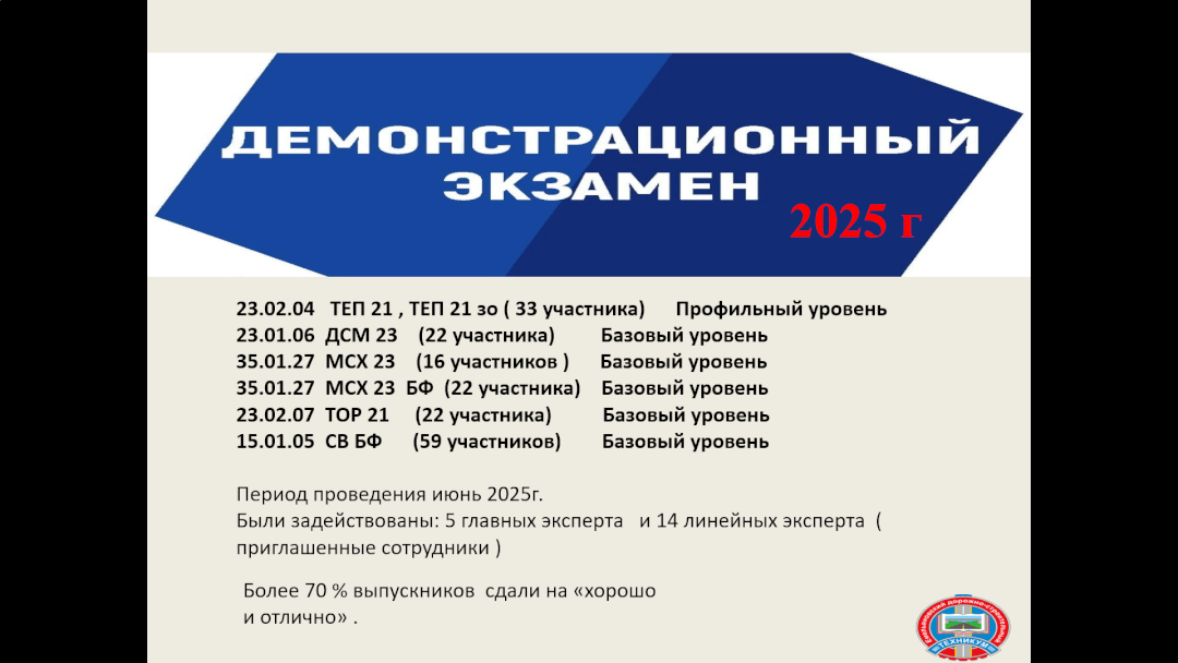 Демонстрационный экзамен — это форма итоговой аттестации студентов среднего профессионального образования (СПО), в ходе которой они выполняют практические задания, максимально приближенные к реальным профессиональным условиям.